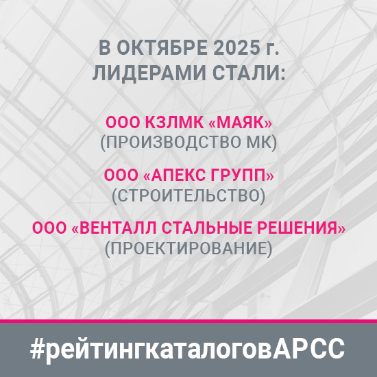 Каждый месяц АРСС публикует рейтинг наиболее просматриваемых компаний в каталогах производителей металлоконструкций, строительно-монтажных организаций и реестре проектировщиков.