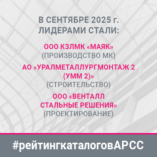 Каталоги Ассоциации развития стального строительства — это инструмент для удобного поиска подрядчиков в области стального строительства по проектированию, изготовлению металлоконструкций и монтажу. Каждый месяц АРСС публикует рейтинг наиболее просматриваемых компаний в каталогах производителей металлоконструкций, строительно-монтажных организаций и реестре проектировщиков.