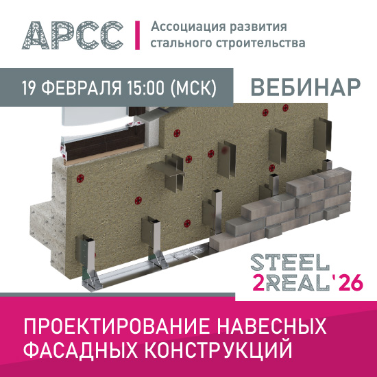 19 февраля 2026 г. в 15:00 (МСК) Ассоциация развития стального строительства (АРСС) проведет бесплатный вебинар на тему «Проектирование навесных фасадных конструкций».