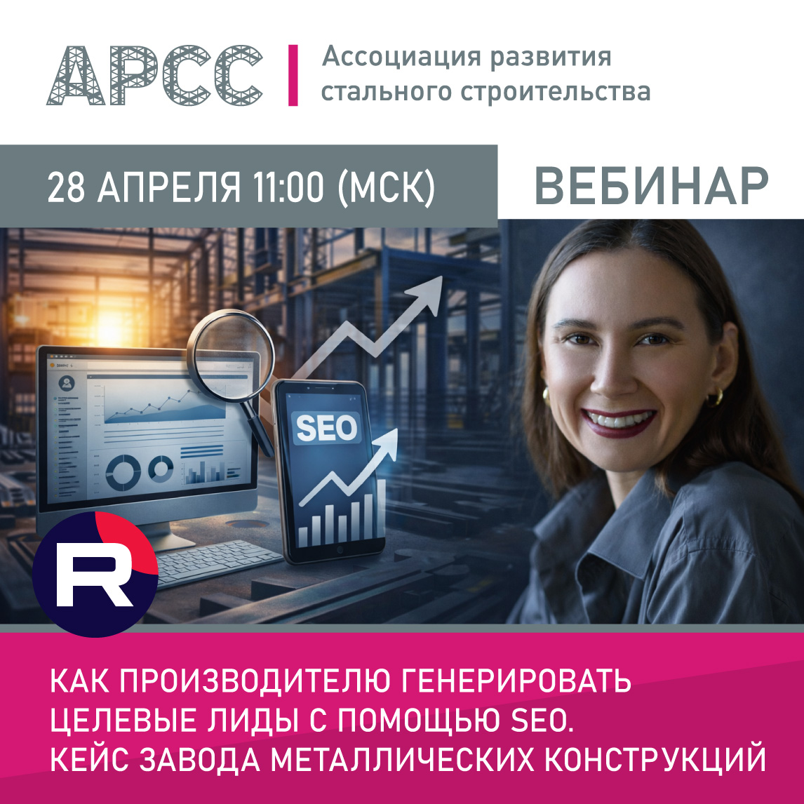 28 апреля 2026 г. в 11:00 (МСК) Ассоциация развития стального строительства (АРСС) проведет бесплатный вебинар на тему «Как производителю генерировать целевые лиды с помощью SEO. Кейс завода металлических конструкций».