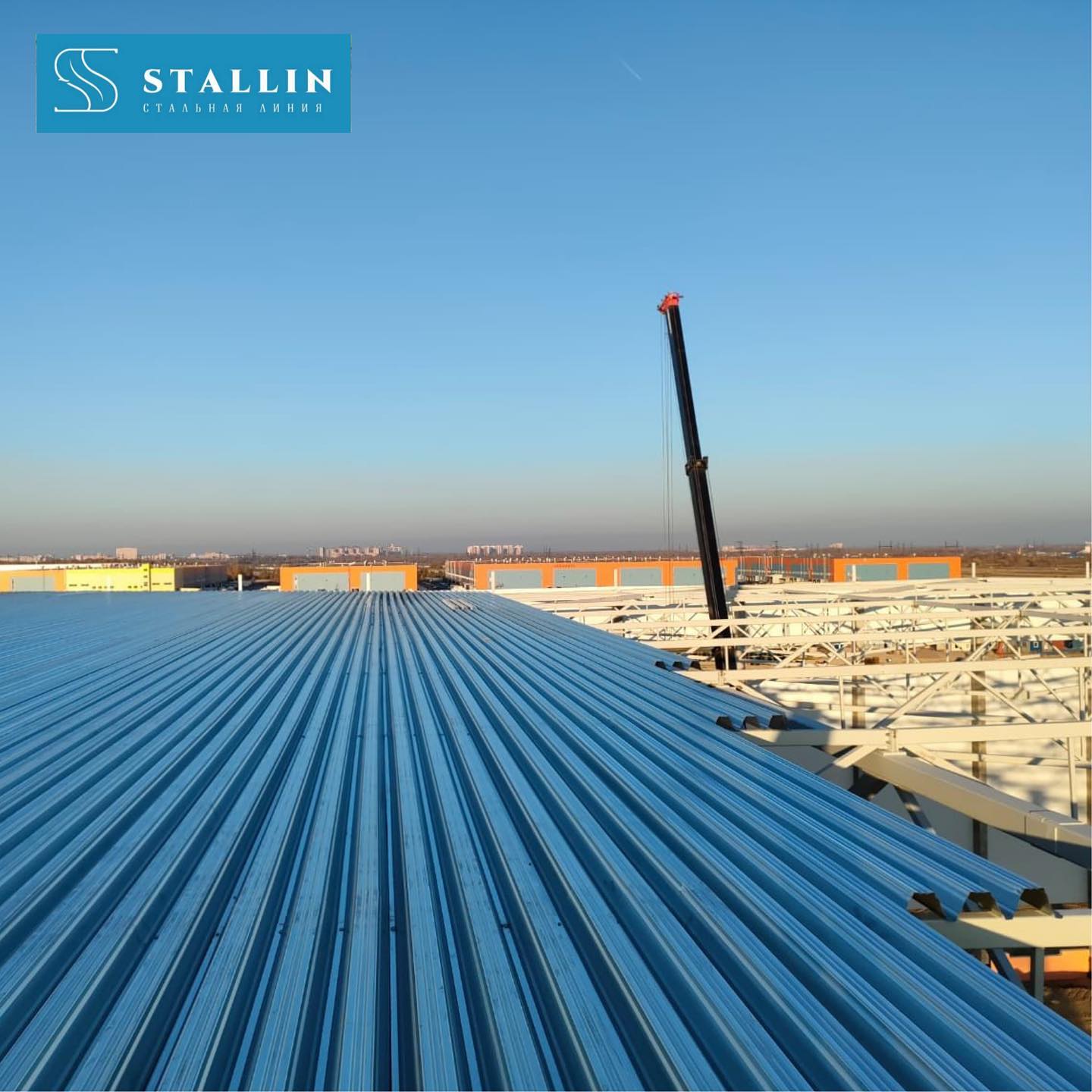 Технология производства быстровозводимого здания и высокая заводская готовность позволили ускорить процесс монтажа. На строительной площадке ведется досборка каркаса. Для доставки профилей и других элементов понадобилось 7 фур и 2 трала.