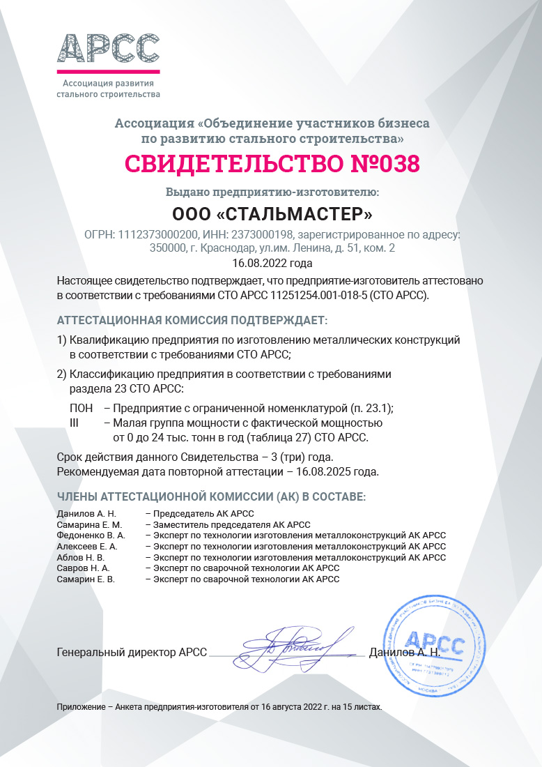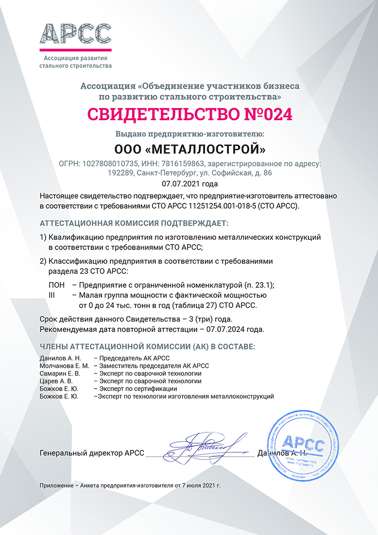 В основе процедуры аттестации лежит Стандарт Организации, устанавливающий правила по заводскому изготовлению металлоконструкций и контролю качества на производстве черных металлоконструкций и ЛСТК. Документ был разработан ведущими отраслевыми научными институтами – ЦНИИСК им. В. А. Кучеренко, ЦНИИПСК им. Мельникова, Национальное агентство контроля сварки (НАКС) при участии экспертов АРСС.