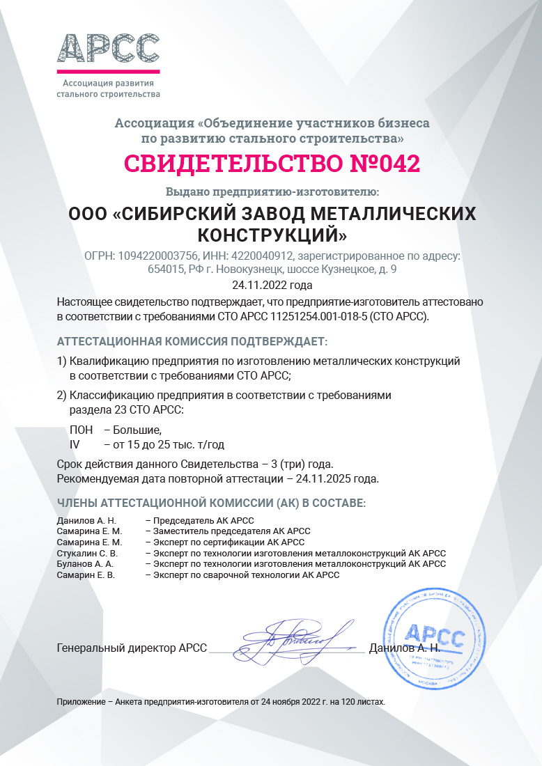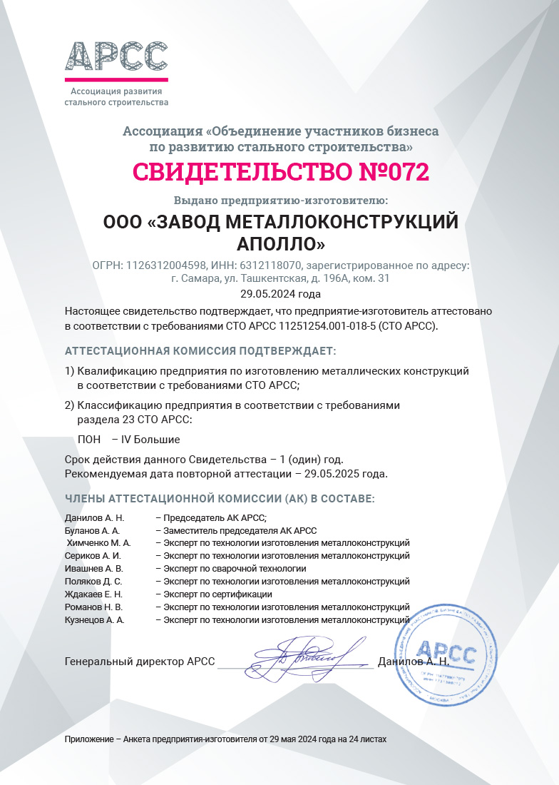 Аттестация заводов металлоконструкций по СТО АРСС создана с целью выявления заводов, производящих качественные металлоконструкции зданий и сооружений, для дальнейшего их продвижения в тендера учредителей АРСС и заказчиков отрасли.